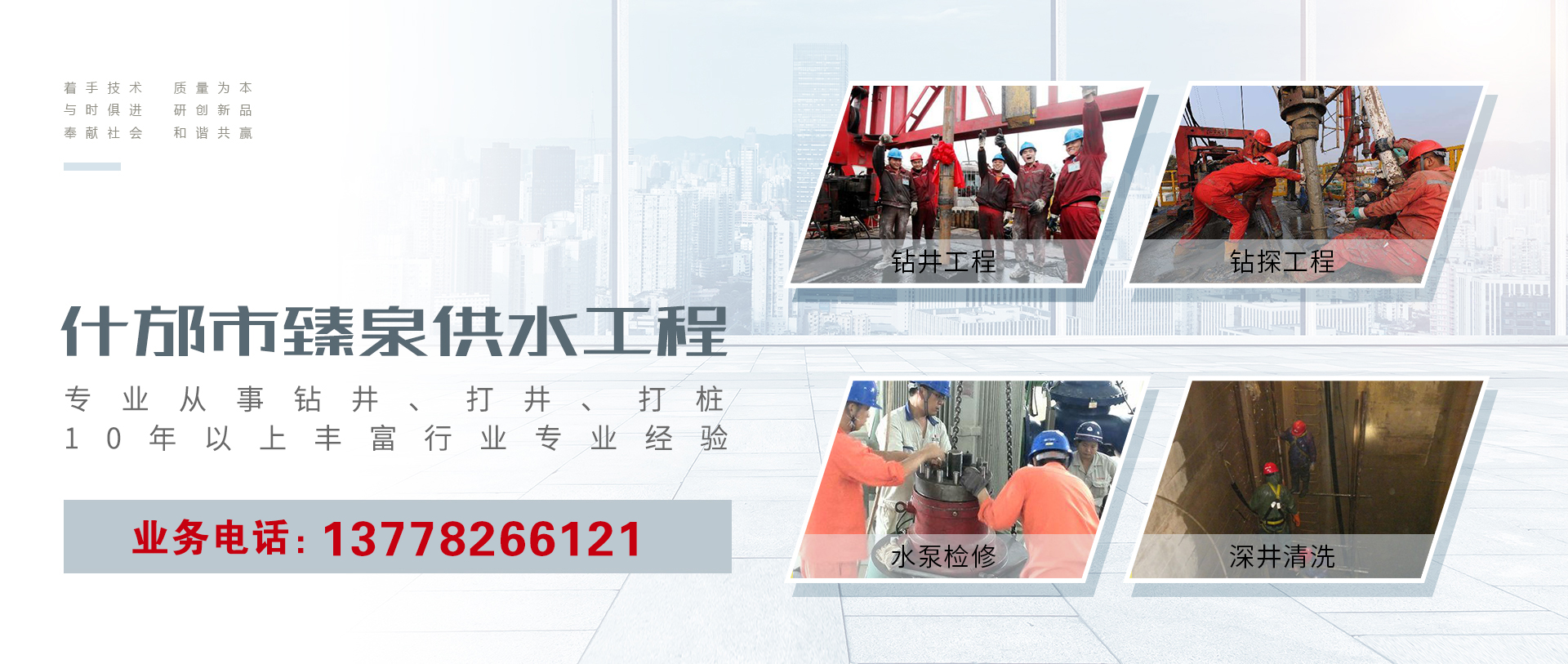 什邡市臻泉供水工程有限公司,座落于四川省德陽市什邡市南泉鎮南陽村15組,公司成立于2017年,目前是四川德陽地區專業從事工地降水井施工、降水井排水管道安裝布設、農業灌溉井施工、工業深水井施工、人畜飲水工程深水井施工、野外地下水勘探、工地基礎護壁樁、橋梁承重樁施工的專業打井、降水、打樁、水塔安裝的施工隊伍。 公司在成立的前身是一支10多年時間常年在四川甘孜州、阿壩州、德陽市、成都市、綿陽市、南充市、遂寧市、青海省玉樹自治州、西藏自治區日喀則市、阿里地區、...